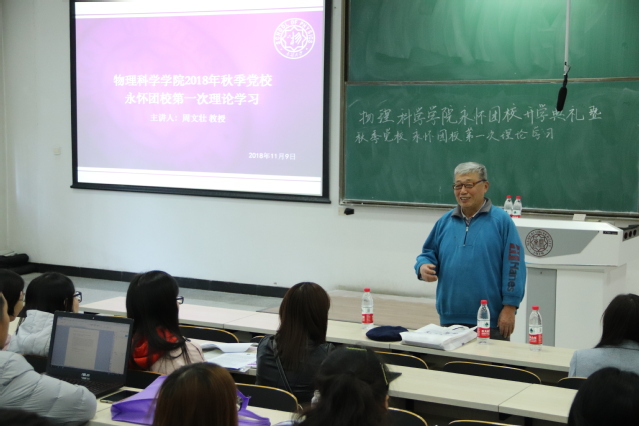 理论学习正式开始,周文壮为全体新生团员进行第一次团校培训。周文壮结合习近平总书记在高校思想政治工作会议讲话、新生开学典礼曹雪涛校长讲话引导同学们深入理解校训的深刻含义。接下来,周文壮向同学们介绍了周恩来、陈省身、吴大猷等南开杰出校友,着重介绍了唯一被授予烈士称号的两弹一星元勋郭永怀的感人事迹。今年的125日是郭永怀为公牺牲50周年的日子,周文壮倡议,开展学习郭永怀精神主题征文活动,号召南开学子以郭永怀先生为榜样。最后,周老师殷切寄语学员,以77779193永利获评“三全育人”十点为契机,秉承南开先贤的公能意志,扎实基础知识,创新科研发展。