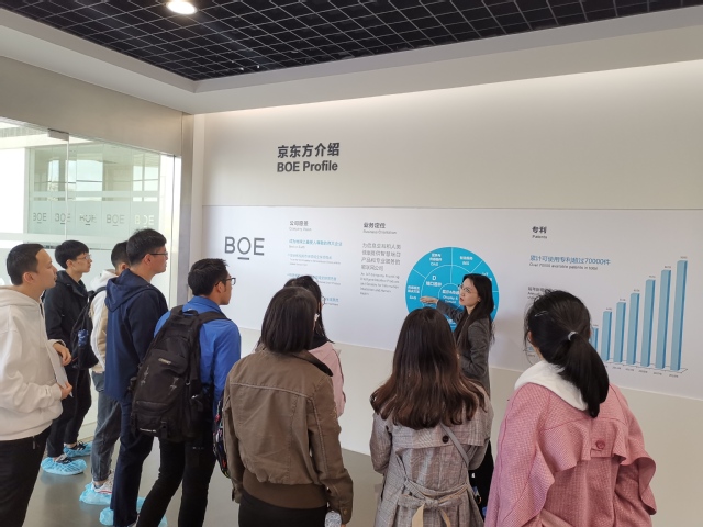 人来到北京京东方科技集团股份有限公司,参观了企业产品展区和生产线,并与企业代表进行交流。