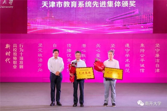 在新中国成立70周年、南开大学建校100周年之际,在全国第35个教师节到来之日,9月10日,南开大学在八里台校区举行2019年教育教学奖励大会暨新教工入职仪式。大会对在学校教书育人等工作中作出突出贡献的先进集体和个人进行表彰,宣传他们爱岗敬业、无私奉献的优秀事迹,在全校营造比学先进、尊师重教的良好氛围,进一步增强广大教师和全校师生员工建设“南开品格 中国特色 世界一流”大学的荣誉感和责任感。