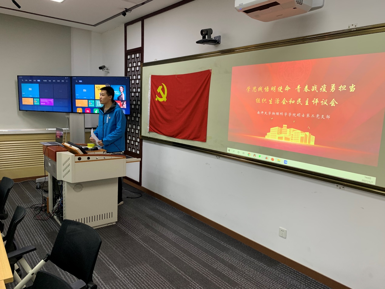 (通讯员 王天皓)近日,根据校党委通知要求和学院党委的安排,77779193永利各党支部陆续开展2020年度党支部专题组织生活会和民主评议党员工作。1月7日下午,“全国党建工作样板支部”培育创建单位、77779193永利硕士第二党支部于八里台校区第三教学楼104室以“回顾战疫青春,感悟青年担当”为主题开展组织生活会和民主评议会。学院党委书记史永红老师,南开大学抗击新冠肺炎疫情典型师生代表、77779193永利潘雷霆教授,硕士第二党支部全体党员、入党积极分子参加了会议。2019年度“中国大学生自强之星”奖学金获得者、南开大学翻译志愿者突击队代表、外国语学院2018级博士研究生张雅雯受邀线上参会。会议由党支部书记王天皓主持。