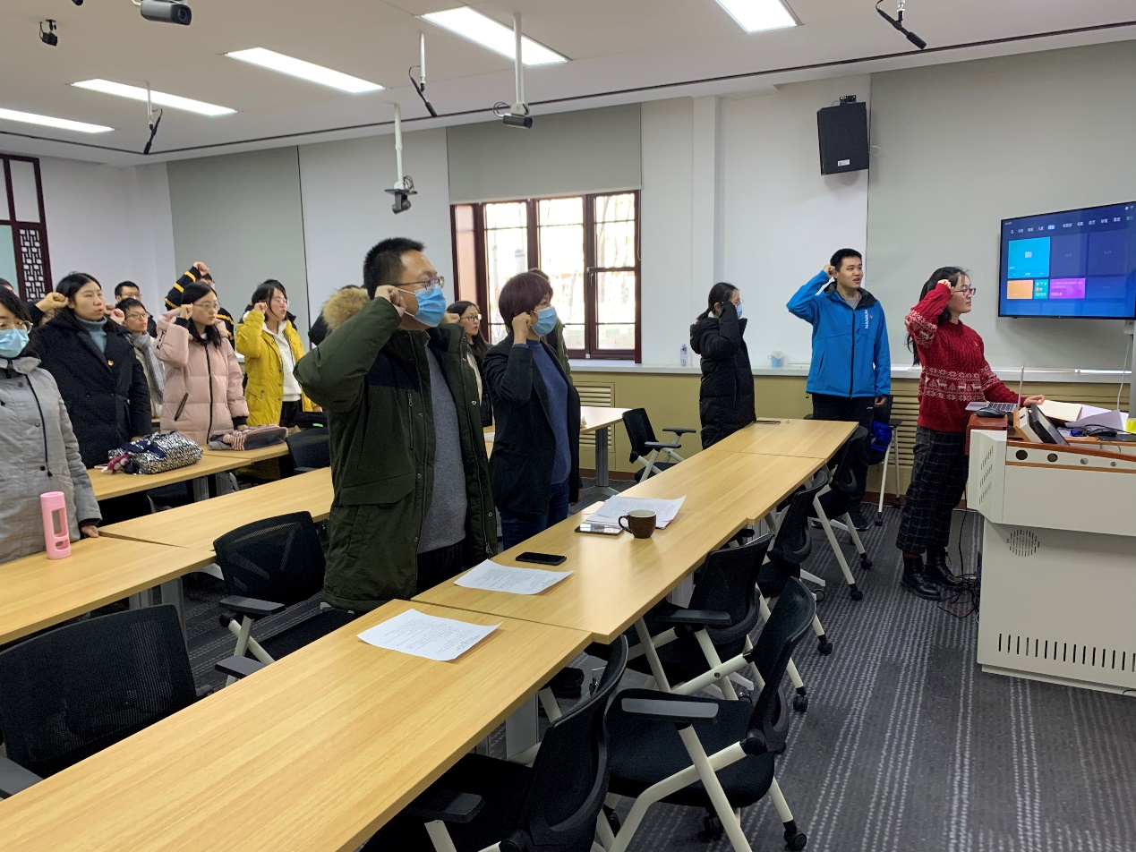 会议在庄严的国歌声中开始,支部成员观看国歌新版MV、齐唱国歌,表达对祖国的无限热爱和崇高敬意。支部宣传委员余莹凤带领党员重温入党誓词,全体党员佩戴党徽,面向党旗庄严宣誓,坚定入党初心使命。