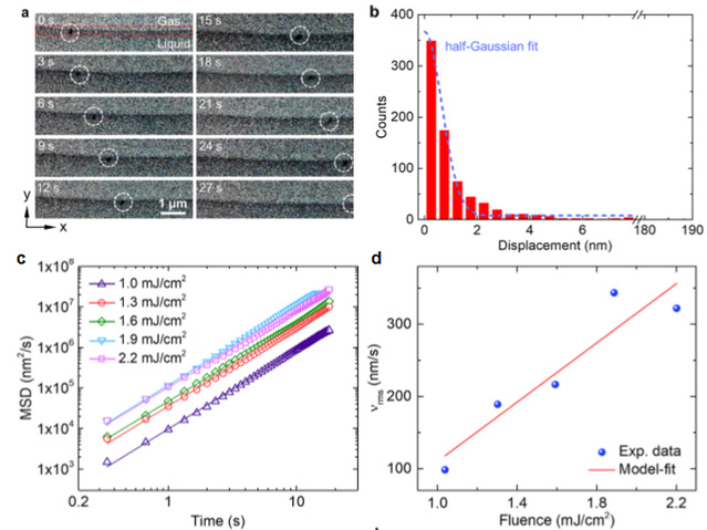 图1:a、粒子沿气液界面运动的典型照片;b、沿x轴位移的分布,蓝线表示半高斯拟合;c、不同激光通量下,MSD与t的关系;d、激光通量与νrms的关系。