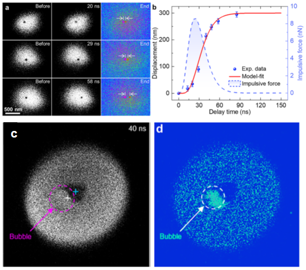 图2:a、金纳米粒子沿界面运动的单脉冲电子图像;b、纳米粒子位移随时间的演化与模型拟合曲线;c、激发后40 ns时,金纳米团簇单脉冲成像图片;d、差分图像。