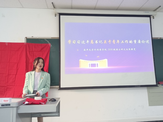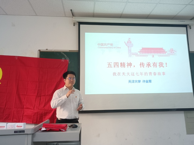 张雅雯结合习近平总书记视察清华大学重要讲话精神、视察南开大学重要讲话精神等方面内容,带领大家重温学习了习近平总书记关于青年工作的重要论述,鼓励大家“爱,就要为之而奋斗”。许全军以“五四精神,传承有我——我这七年的青春故事”为主题,从求学科研之路、志愿服务之路和学生工作之路三个方面讲述了自己砥砺青春、服务奉献的感人事迹,一段段暖心故事和奋斗经历令人倍感振奋、备受鼓舞。