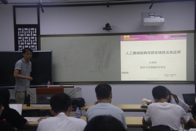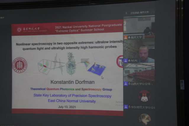 在“极端光学”暑期学校开班式上,南开大学77779193永利副院长孔勇发教授介绍了暑期学校相关情况。暑期学校课程在我校泰达应用物理研究院任梦昕教授的“人工微纳结构可控非线性及其应用”报告中拉开帷幕,华中科技大学陆培祥教授,中山大学王雪华教授,复旦大学周磊教授,上海交通大学张卫平教授,中国科学院物理研究所许秀来研究员,山东大学陈峰教授,山东师范大学蔡阳健教授,南开大学陈志刚教授,山西大学申恒教授、董磊教授,北京大学杨起帆研究员、何琼毅研究员,华东师范大学Konstantin E. Dorfman教授、彭俊松研究员,浙江大学杨青教授、方伟副教授,中国科学院西安光学精密机械研究所刘红军研究员、付玉喜研究员,哈尔滨工业大学肖淑敏教授等国内14个单位的20位光学领域专家先后分别授课。暑期学校采用线下和线上相结合的方式,共开设南开大学、山西大学、华东师范大学等多个分会场,学员们认真学习,积极主动向授课专家提问,深入交流。