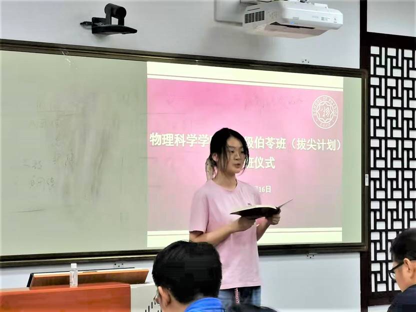 2019级伯苓班本科生聂彬彬对2021级拔尖班新生表示了衷心的祝福,根据自身的经历提出在大学期间的建议,他勉励同学们一定在生活中要有热爱,去探索物理的魅力,希望大家做一个脚踏实地的理想主义者,不忘初心、奋发向上、坚持热爱、保持纯粹。2021级伯苓班(拔尖计划)本科生郭睿同学表达了踏入大学生活、进入伯苓班的激动与向往,并号召同学们要保持激情,将激情贯穿每天,必能历经风雨、终见彩虹。
