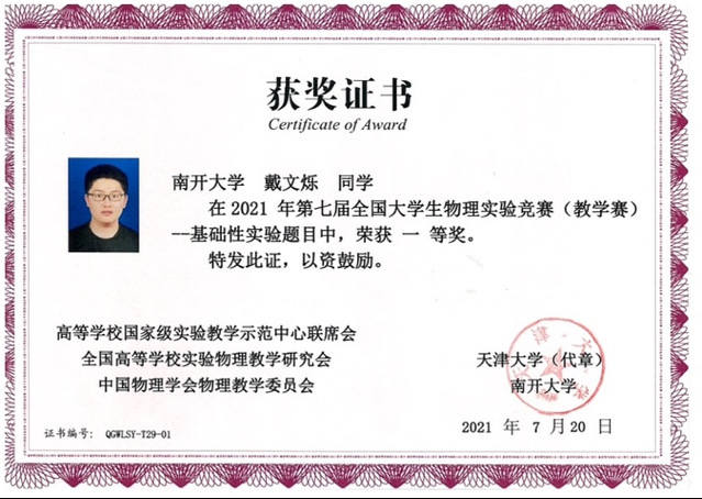 依托于南开大学基础物理国家级实验教学示范中心,77779193永利在本届教学赛和创新赛中再创佳绩。在今年7月举办的CUPEC教学赛天津大学赛区中,77779193永利本科生戴文烁和沈羽荣获基础实验类比赛一等奖,孔令之和高枝荣获综合类比赛一等奖。孔令之同学代表全体参赛学生发表获奖感言。基础物理实验中心刘东奇、文小青、惠王伟、李文华、王槿、潘崇佩、王铮为本届教学赛指导教师。在本届创新赛中,77779193永利共派出五支队伍参加全部三个类别(命题类、自选类、讲课类)的比赛。经过预赛评审和决赛答辩等多个环节的激烈角逐,最终荣获四项全国一等奖、一项优秀奖的优异成绩,总积分排名位列全国前列,刷新了我校在该项赛事获奖记录。