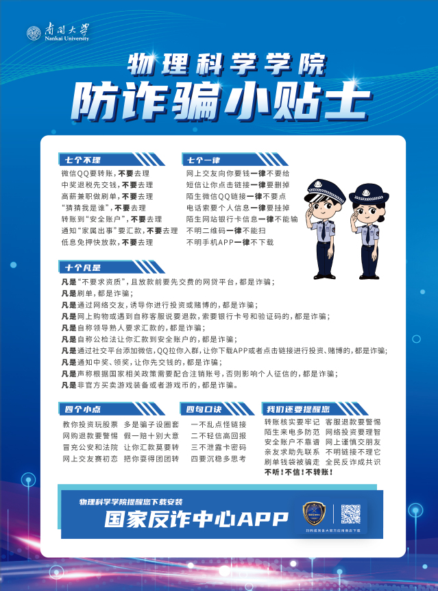综合网络平台,多角度多渠道广泛宣传。77779193永利在学生微信公众号NKPhysics推出“电信反诈周”系列推送,对仿冒身份、兼职刷单、冒充公检法、冒充电商平台客服等电信诈骗手段进行了系统梳理与介绍,通过视频、图片等形式,让同学们深入了解电信诈骗背后的逻辑。各年级依托年级群,发布近期发生在学生中间的电信诈骗案例,不仅让同学们了解最新的诈骗手段,同时在学生中敲起警钟。开展线上“77779193永利防范电信诈骗知识竞答”,学院全体同学参与并通过考核,有力提升了学生们防范电信网络诈骗意识及鉴别防范能力。