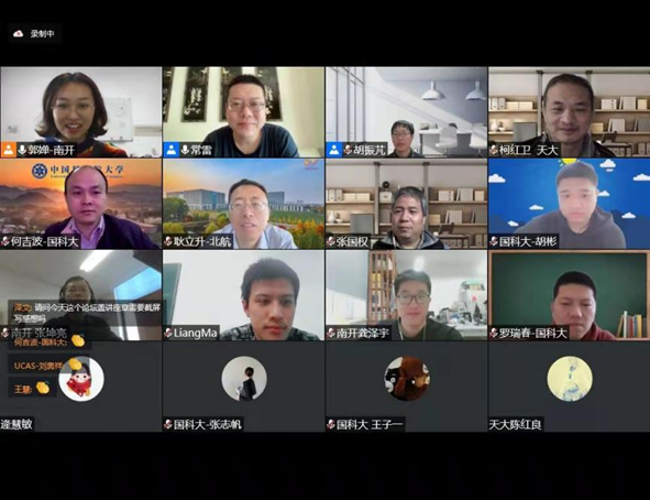 在网络会议研讨室,来自四所高校的24位优秀博士后、研究生分别围绕自己的科研内容、研究进展展开报告,内容涉及新型冠状病毒的感染机制以及相关药物设计、非线性拓扑光子晶格、北京谱仪III实验ZCS(3985)的发现等多个主题。南开大学张国权、常雷、胡振芃、张心正、胡毅、潘雷霆,北京航空航天大学耿立升、陆俊旭、周小朋,天津大学王子武、柯红卫,中国科学院大学何吉波等专家教授应邀出席,担任学术和学业指导顾问。