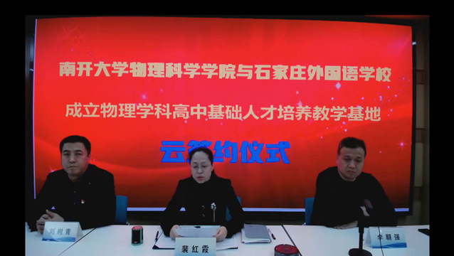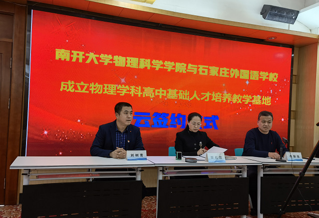 石家庄外国语学校校长裴红霞首先对南开大学的支持表示感谢。她指出,石家庄外国语学校是河北省示范性高中,是教育部批准的河北省唯一一所全国普通高校招生保送资格学校,是普通高中新课程新教材实施国家级示范校。学校始终坚持“以人为本”的办学理念,坚持落实“立德树人”的根本任务,致力于培养学生的爱国情感、交际能力、协作意识、文明素养、健康身心、创新精神,既有中华优秀传统文化底蕴,又有国际视野的具有国际竞争力的人。她表明南开大学“物理学科高中基础人才培养教学基地”项目在石外落地,学校一定全力配合、支持保障该项目的顺利实施,并且有信心在南开大学各位领导和专家老师的指导下,进一步推进石外物理学科建设,探索物理学科基础人才大中衔接培养的有效模式,共同努力为国家培养更多更优秀的拔尖创新型人才。