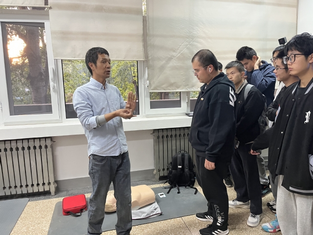 在急救实训教室,医学院崔建林老师悉心安排了急救技能讲授与实地操作环节。他向同学们讲授了心肺复苏急救中畅通气道、人工呼吸、人工胸外按压的原理和操作规程,纠正同学们的急救动作。同时,针对实验室中常见的手部外伤、烧烫伤、触电、肢体骨折等意外伤害情况,崔老师详细讲解了施救方法,要求同学们能够临危不慌,冷静处理。
